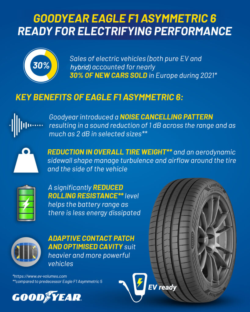 Every tyre in Goodyear’s range is EV-ready, but Eagle F1 Asymmetric 6 has been specifically designed with manufacturers’ EV requirements in mind. Its noise cancelling pattern results in a reduction of 1 dB, shown on the tyre label, while its new compound technology reduces rolling resistance, to help increase electric range. The result is a tyre that is ready for the next generation of mobility.